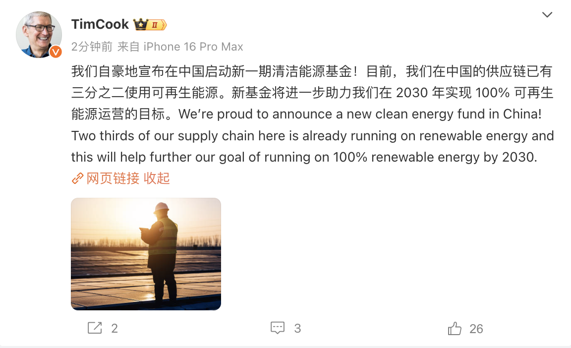 苹果CEO库克宣布在中国启动新一期清洁能源基金